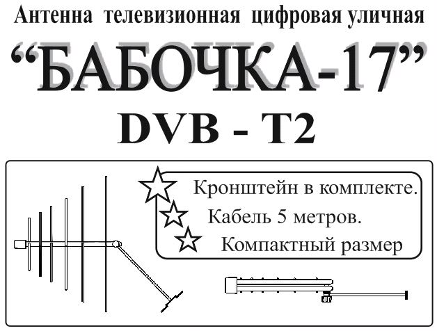 - "БАБОЧКА-17" уличная телевизионная антенна предназначена для приема цифрового DVB-T2 и аналогового телевизионного сигнала ДМВ диапазона