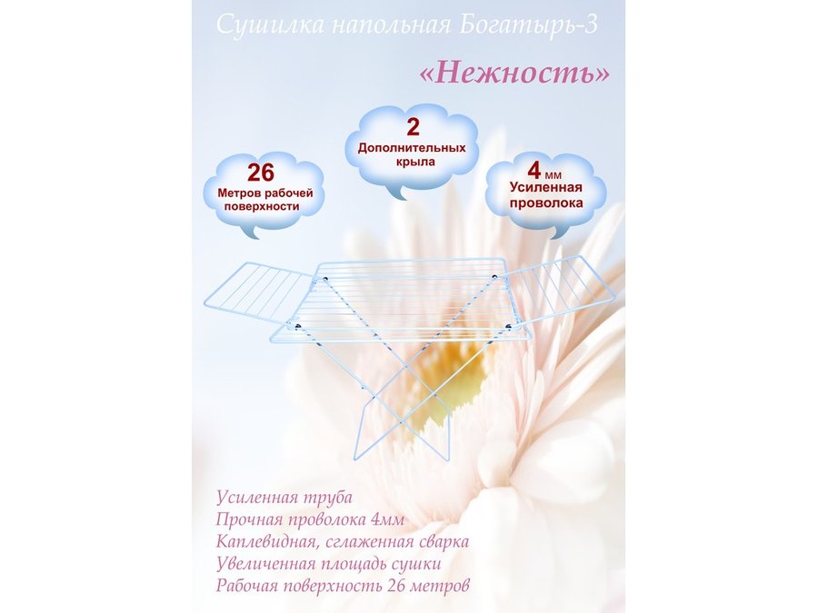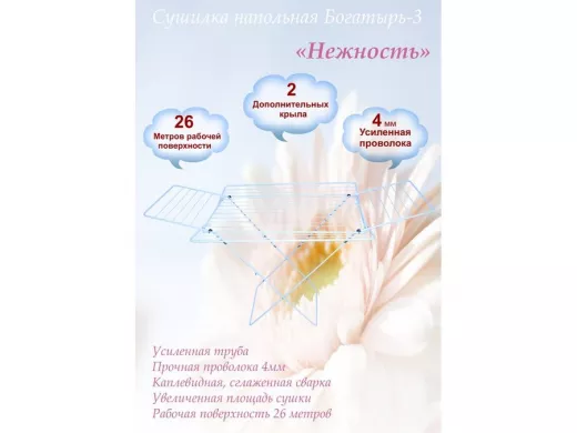 - "БОГАТЫРЬ-3" НЕЖНОСТЬ сушилка напольная БЕЛАЯ 26 метров, предназначена для сушки белья