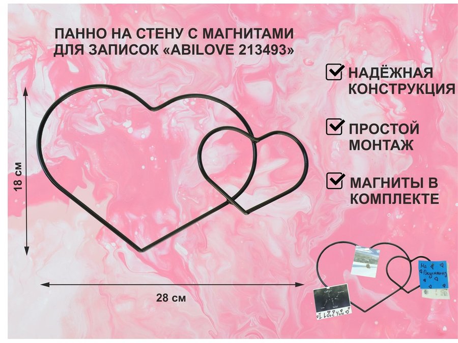 В корзину Купить в 1 клик Панно на стену с 3 магнитами для записок и фотографий, два сердца, чёрный "ABILOVE 213483"