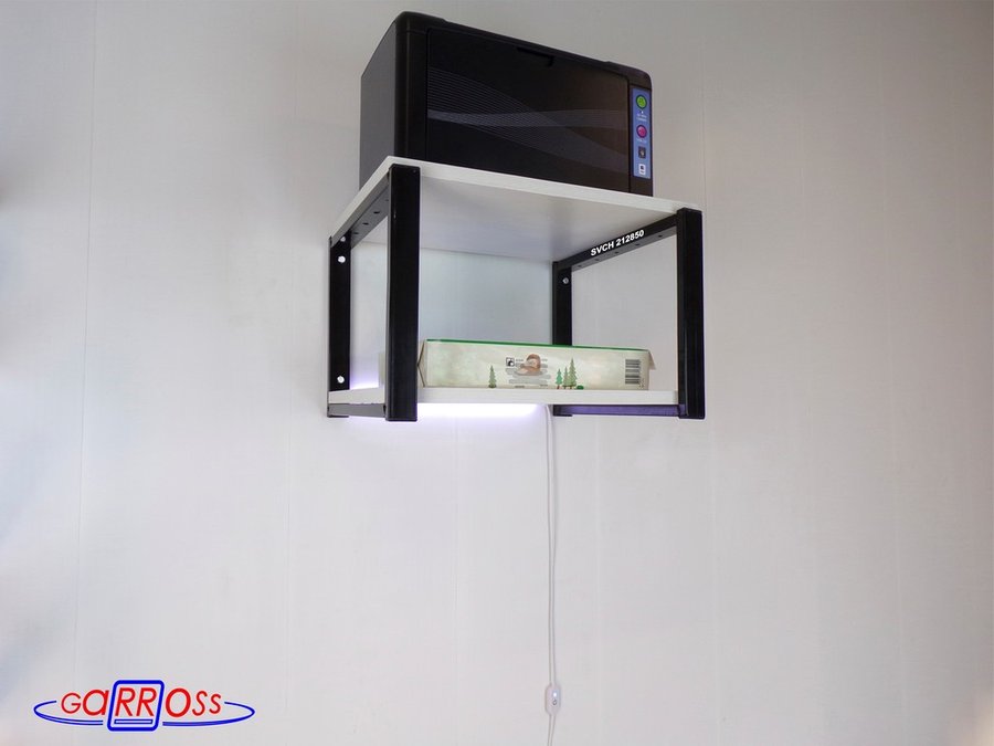 - Полка надежно крепится к стене при помощи анкеров или шурупов с дюбелями, на ней можно разместить принтер, сканер, МФУ и другую офисную технику
