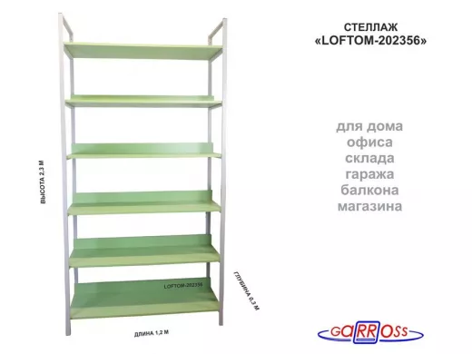 Стеллаж 6 полок, серый "LOFTOM-202356" салатовый, высота 230, ширина 33, длина 120см, полка 120х30см