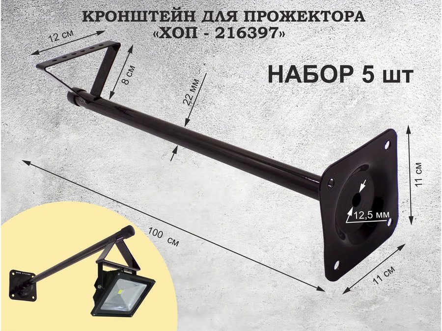 В корзину Купить в 1 клик Набор 5шт. Кронштейн для прожектора к стене, вылет 1 м. "ХОП-216397" сталь, черный, диаметр 22мм,