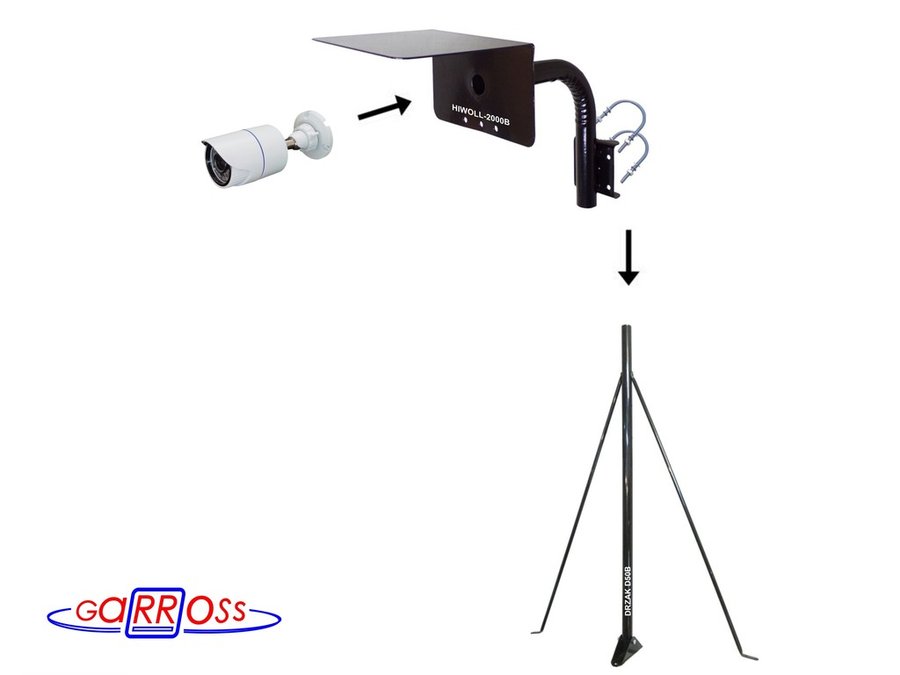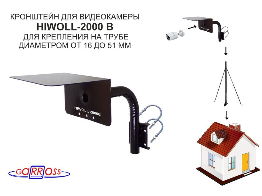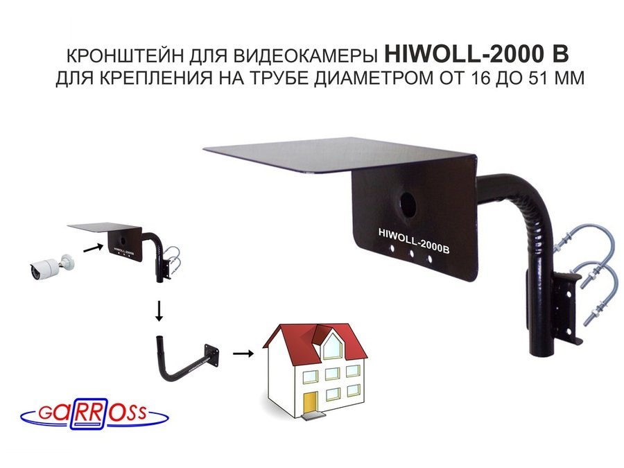 Кронштейн "HIWOLL-2000B-121405" чёрный с хомутами и козырьком на мачту для видеокамеры и прожектора