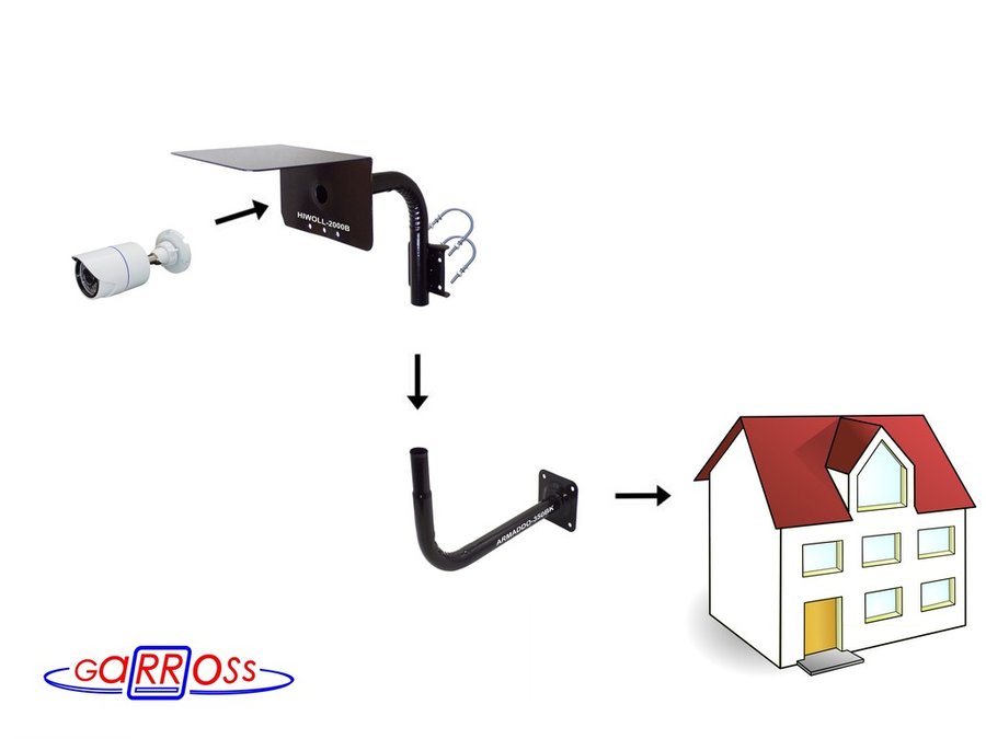 Конструкция кронштейна имеет сквозное отверстие у козырька (где крепится камера), что позволяет надежно спрятать соединения кабеля. Плотный, непрерывный сварочный шов позволяет защищать кабель от внешних воздействий (дождь, снег, ветер), что гарантирует защиту соединения между камерой и кабелями
