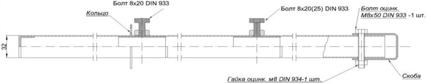 Для наращивания прямых участков применяется элемент "ХОМУТТО-32B", с одной стороны он обжат, а с друхой имеет вваренную гайку и болт М8х30 для соединения деталей.