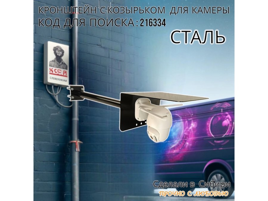 - Универсальный кронштейн с козырьком предназначен для крепления поворотной или цилиндрической камеры и прожектора на трубу.
