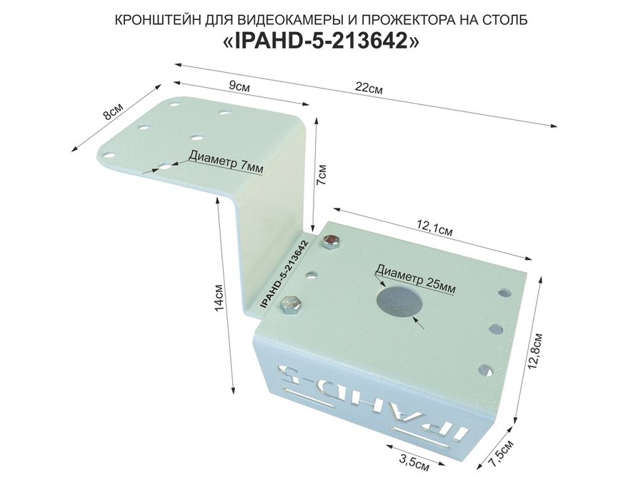 - С данным кронштейном нет необходимости в фиксации дополнительного крепежа под установку камеры и прожектора, все крепежные отверстия имеются на кронштейне. Три отверстия вверху диаметром 7мм и шагом 30мм и три внизу позволяют закрепить опции: водо-снего-солнце защитный козырёк (код товара: 90396) или светодиодный прожектор.