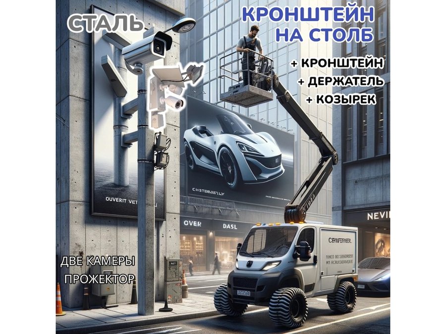 Кронштейн с козырьком и площадкой под монтажную коробку для крепления двух камер и прожектора на столб при помощи ленты или хомутов