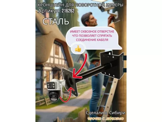 - Кронштейн для крепления видеокамеры на столб имеет сквозное отверстие, что позволяет спрятать соединения кабеля, тем самым защищает их от внешних воздействий (дождь, снег, ветер) поэтому нет необходимости использовать дополнительный гермобокс, т.к. разъемы спрячутся в трубе.
