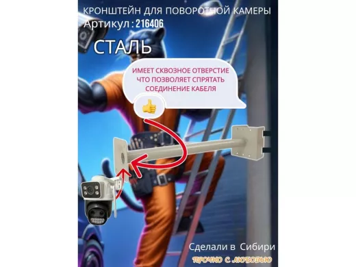 - Кронштейн для крепления видеокамеры на столб имеет сквозное отверстие, что позволяет спрятать соединения кабеля, тем самым защищает их от внешних воздействий (дождь, снег, ветер) поэтому нет необходимости использовать дополнительный гермобокс, т.к. разъемы спрячутся в трубе.