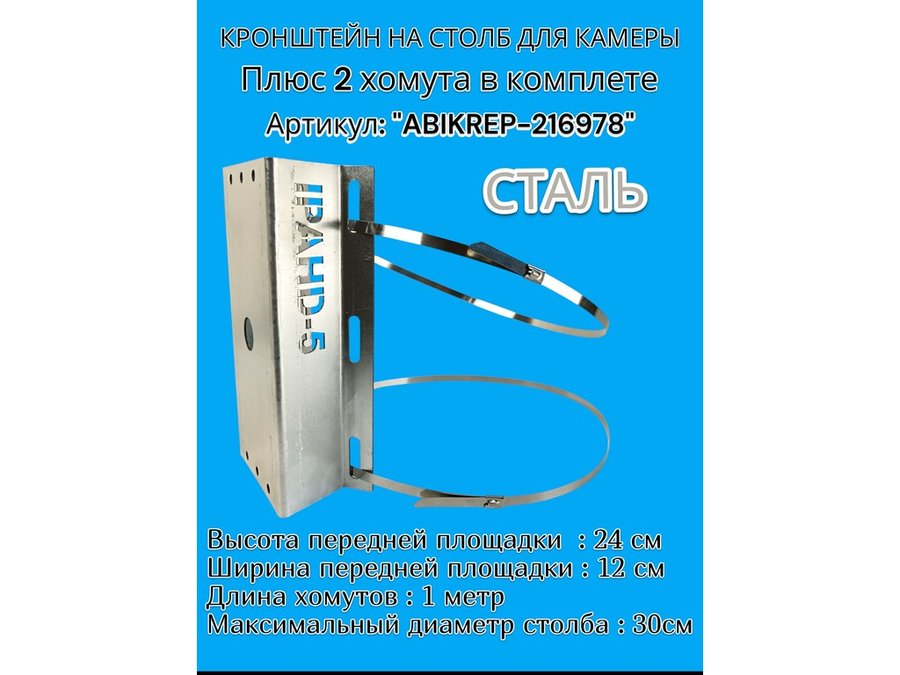Кронштейн оцинкованный для камеры видеонаблюдения с двумя хомутами на столб "ABIKREP-216978" 24х12см