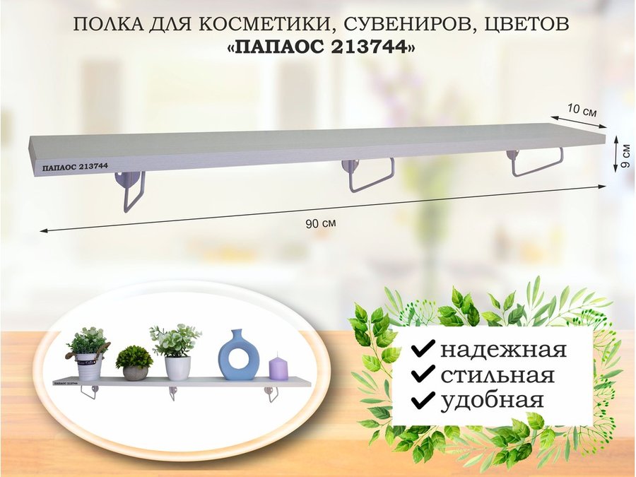 В корзину Купить в 1 клик Полка для косметики, сувениров, цветов, 90х10 см, высота 9 см, серый "ПАПАОС 213744" сосна