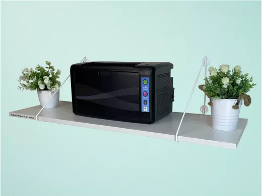 - Полка надежно крепится к стене при помощи анкеров или шурупов с дюбелями, на ней можно разместить принтер, бумагу