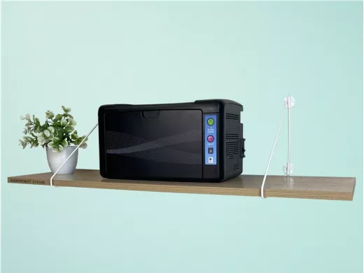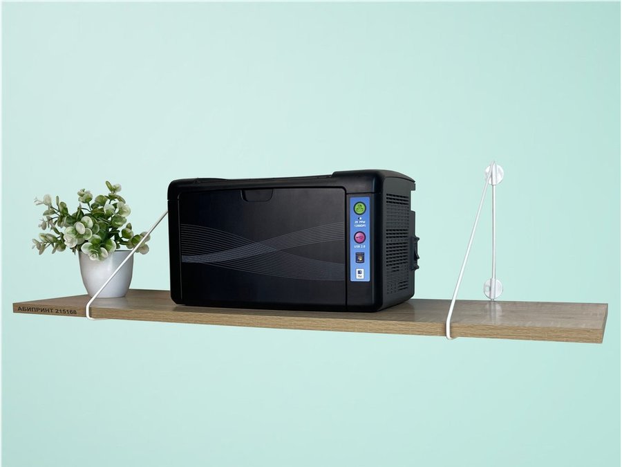 - Полка надежно крепится к стене при помощи анкеров или шурупов с дюбелями, на ней можно разместить принтер, бумагу
