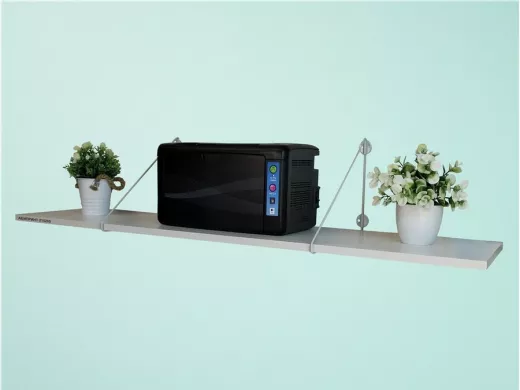 - Полка надежно крепится к стене при помощи анкеров или шурупов с дюбелями, на ней можно разместить принтер, бумагу