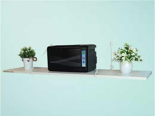 • Полка надежно крепится к стене при помощи анкеров или шурупов с дюбелями, на ней можно разместить принтер, бумагу