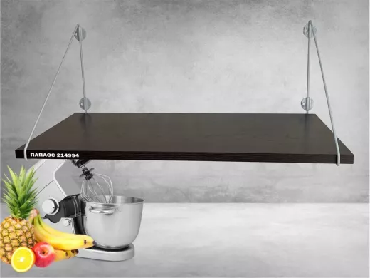 - Полка надежно крепится к стене при помощи анкеров или шурупов с дюбелями, на ней можно разместить микроволновую печь, кухонную технику, посуду, специи и многое другое