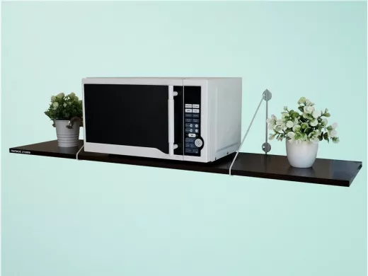 - Полка надежно крепится к стене при помощи анкеров или шурупов с дюбелями, на ней можно разместить микроволновую печь, кухонную технику, посуду, специи
