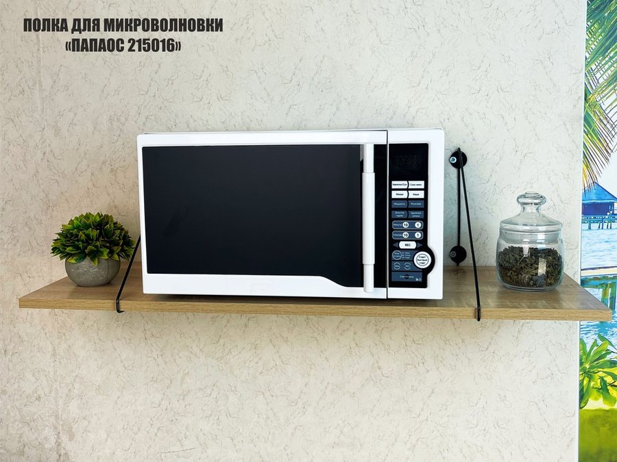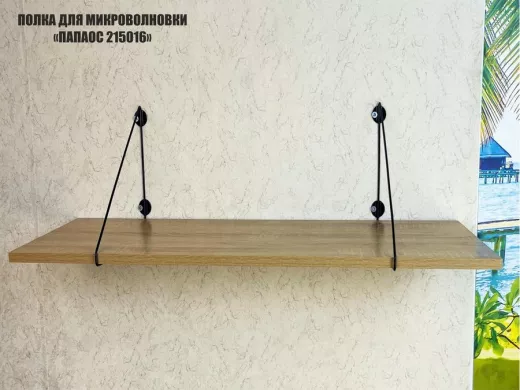 • Полка надежно крепится к стене при помощи анкеров или шурупов с дюбелями, на ней можно разместить микроволновую печь, кухонную технику, посуду, специи