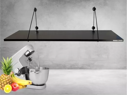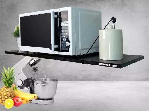 • Полка надежно крепится к стене при помощи анкеров или шурупов с дюбелями, на ней можно разместить микроволновую печь, кухонную технику, посуду, специи