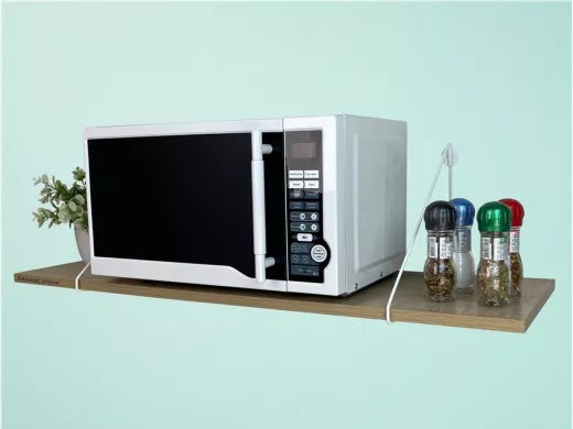- Полка надежно крепится к стене при помощи анкеров или шурупов с дюбелями, на ней можно разместить микроволновую печь, кухонную технику, посуду, специи