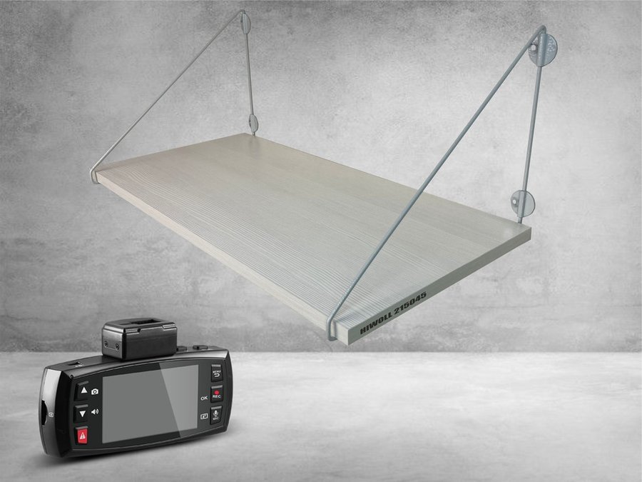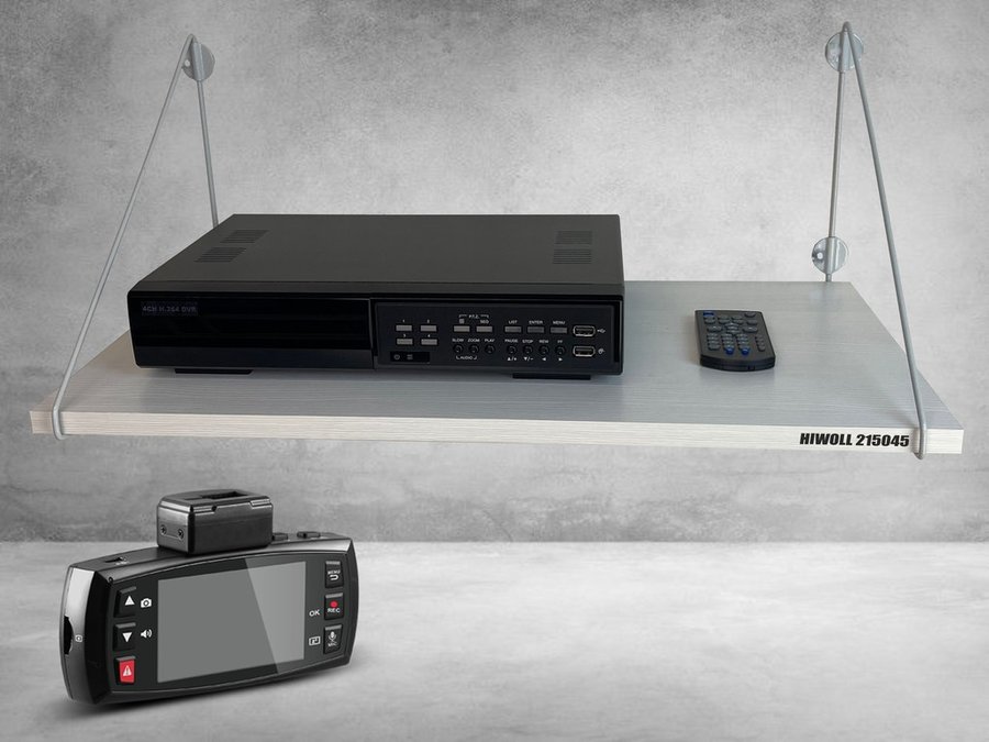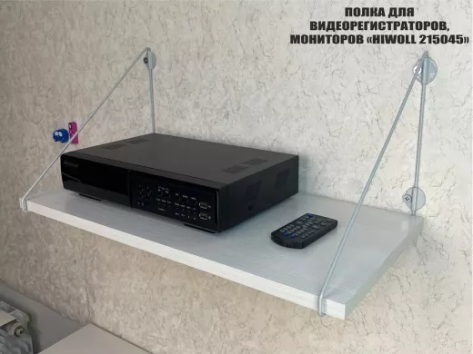 Полка надежно крепится к стене при помощи анкеров или шурупов с дюбелями, на ней можно разместить видеорегистратор, монитор и многое другое