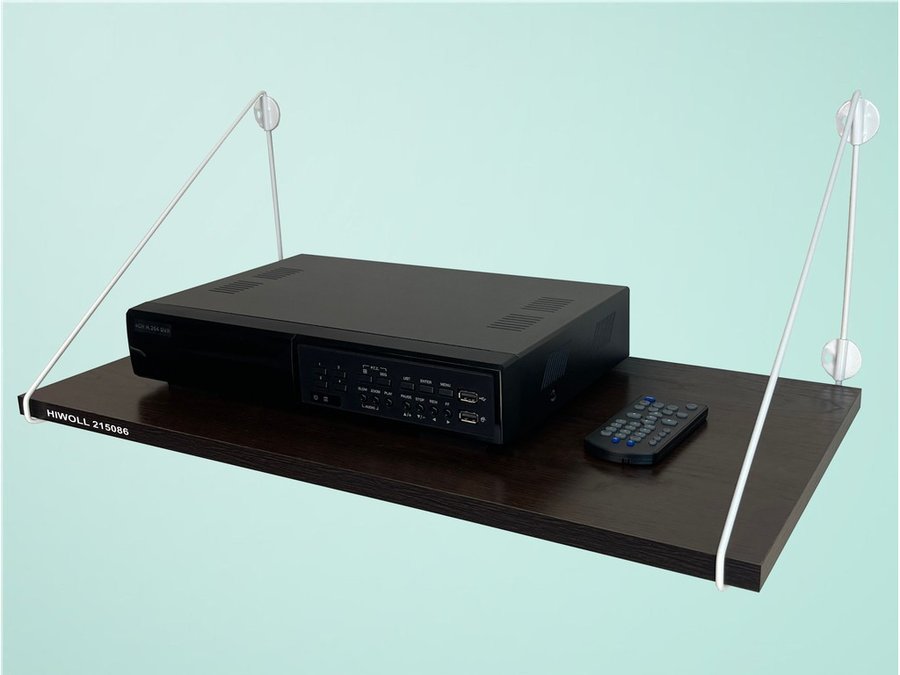 - Полка надежно крепится к стене при помощи анкеров или шурупов с дюбелями, на ней можно разместить видеорегистратор, монитор и многое другое
