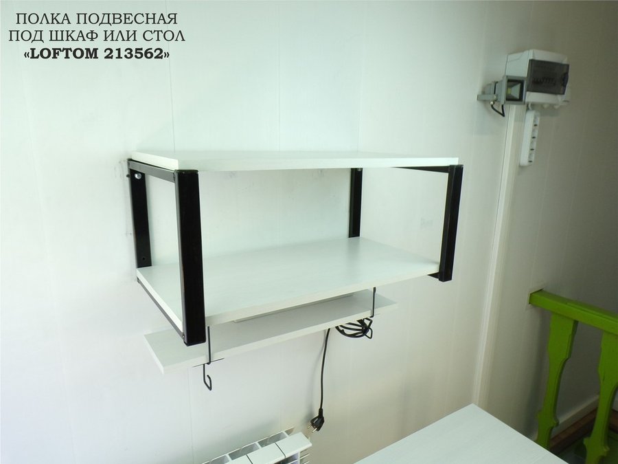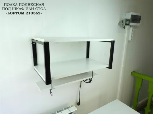 - Подвесная полка фиксируется под столешницей и может использоваться для размещения сетевого фильтра и проводов, чтобы они не мешали на столе или под столом. Также может быть использована на кухне - для хранения специй, стаканов, баночек и тд.