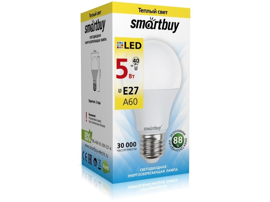 В корзину Купить в 1 клик Светодиодная лампа A60 Е27 5W 3000K Smartbuy-A60-05W/3000/E27