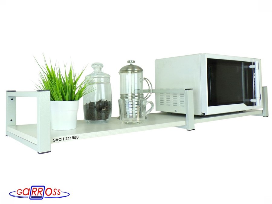 - Полка надежно крепится к стене при помощи анкеров или шурупов с дюбелями, на ней можно разместить микроволнрвую печь, кухонную технику, посуду, специи