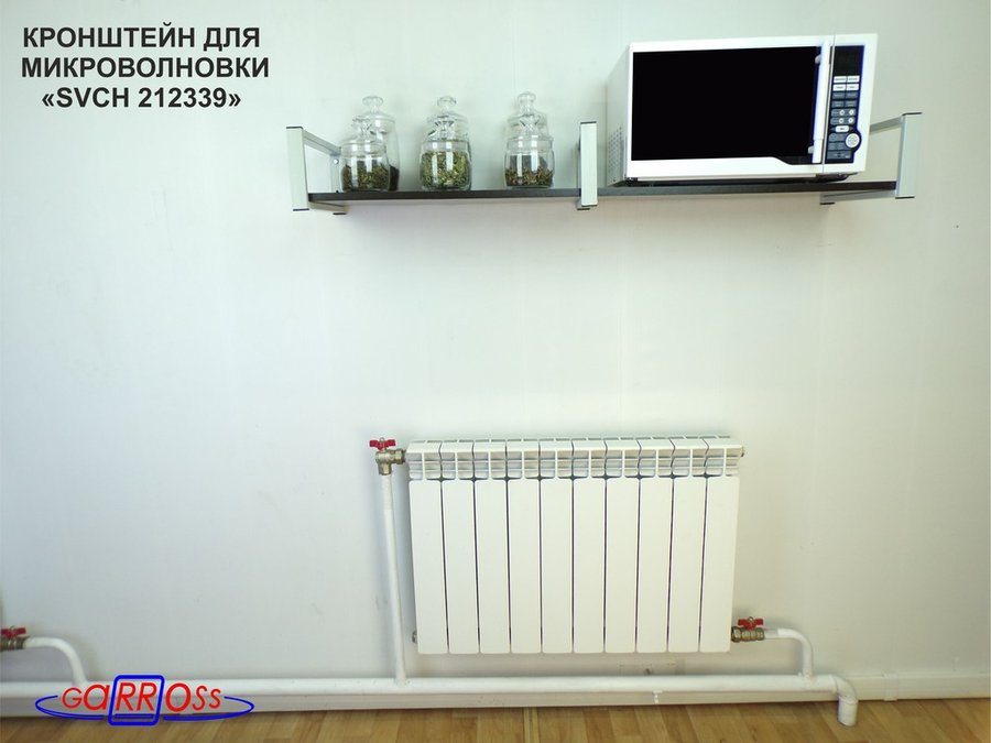 - Полка надежно крепится к стене при помощи анкеров или шурупов с дюбелями, на ней можно разместить микроволнрвую печь, кухонную технику, посуду, специи