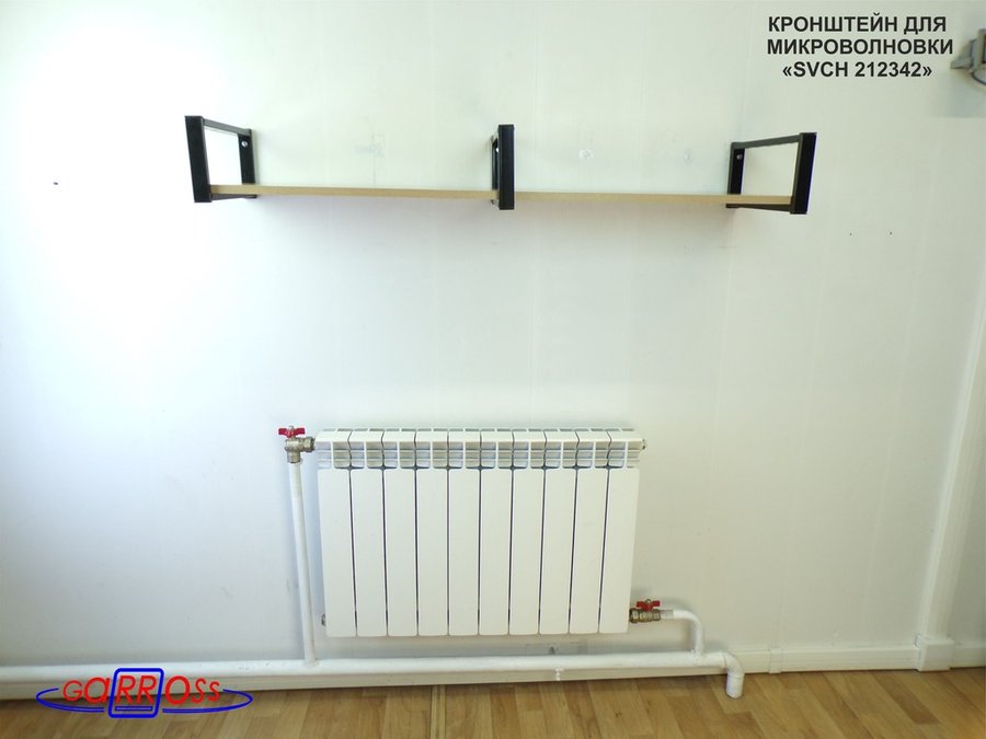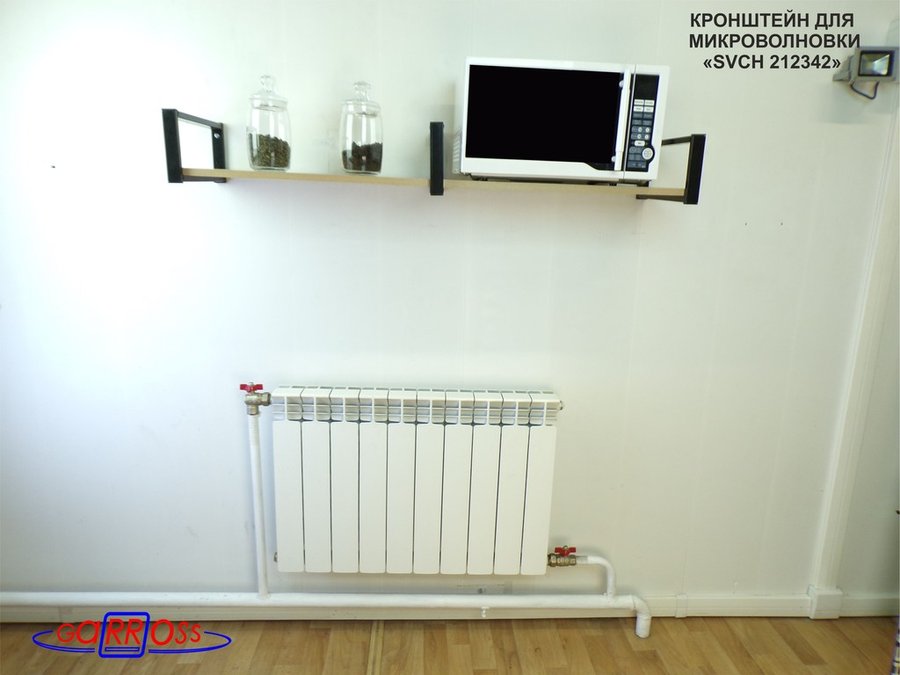 - Полка надежно крепится к стене при помощи анкеров или шурупов с дюбелями, на ней можно разместить микроволнрвую печь, кухонную технику, посуду, специи