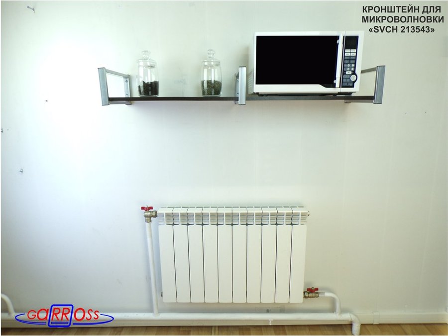 - Полка надежно крепится к стене при помощи анкеров или шурупов с дюбелями, на ней можно разместить микроволнрвую печь, кухонную технику, посуду, специи