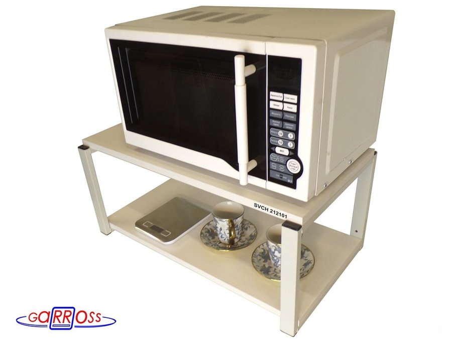 • Полка надежно крепится к стене при помощи анкеров или шурупов с дюбелями, на ней можно разместить микроволнрвую печь, кухонную технику, посуду, специи
