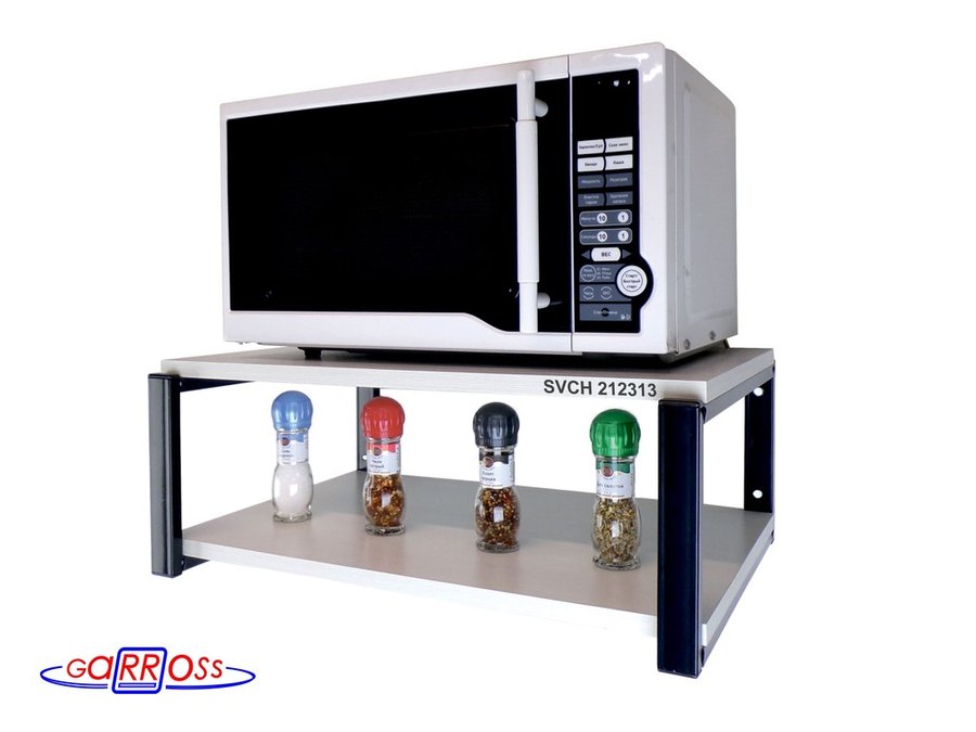 • Полка надежно крепится к стене при помощи анкеров или шурупов с дюбелями, на ней можно разместить микроволновую печь, кухонную технику, посуду, специи