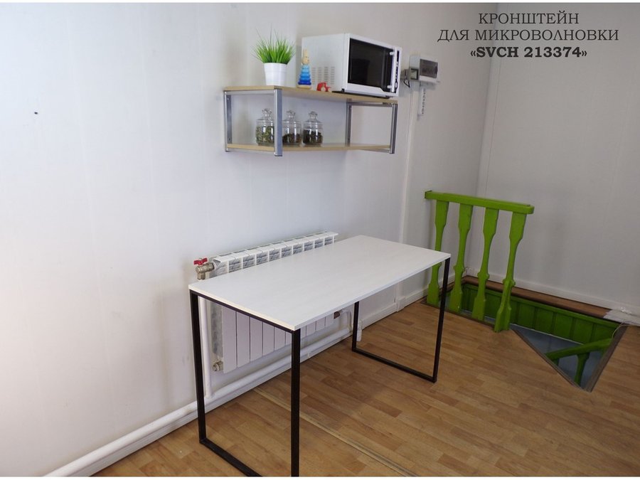 • Полка надежно крепится к стене при помощи анкеров или шурупов с дюбелями, на ней можно разместить микроволновую печь, кухонную технику, посуду, специи