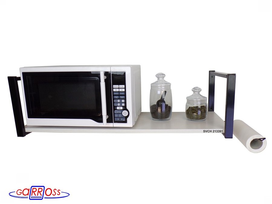 - Полка надежно крепится к стене при помощи анкеров или шурупов с дюбелями, на ней можно разместить микроволновую печь, кухонную технику, посуду, специи