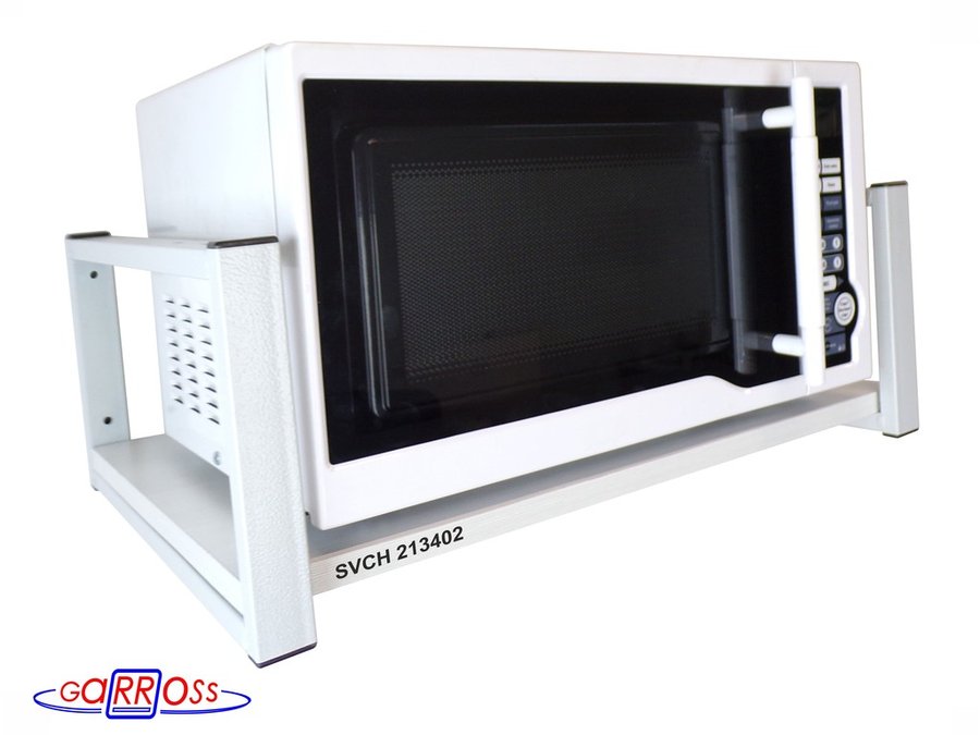 • Полка надежно крепится к стене при помощи анкеров или шурупов с дюбелями, на ней можно разместить микроволновую печь, кухонную технику, посуду, специи