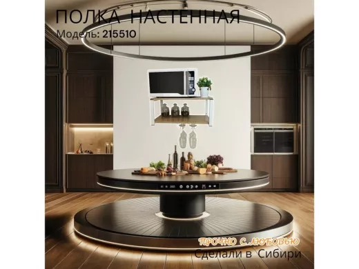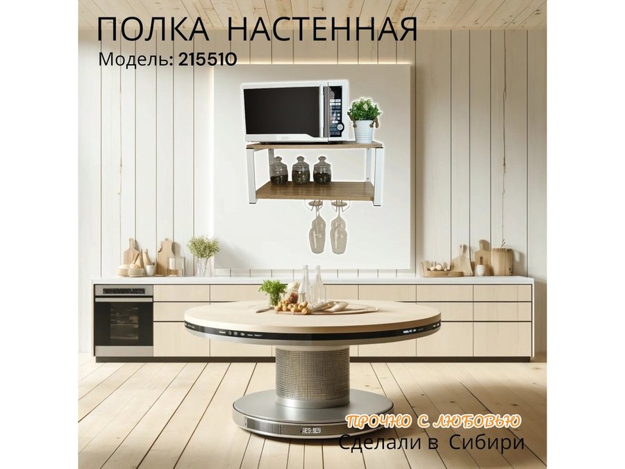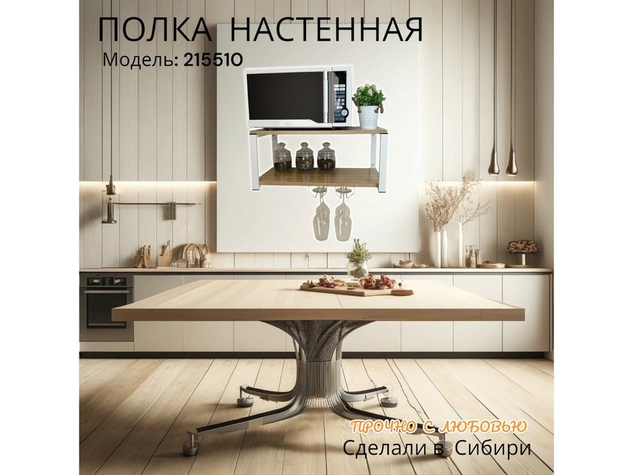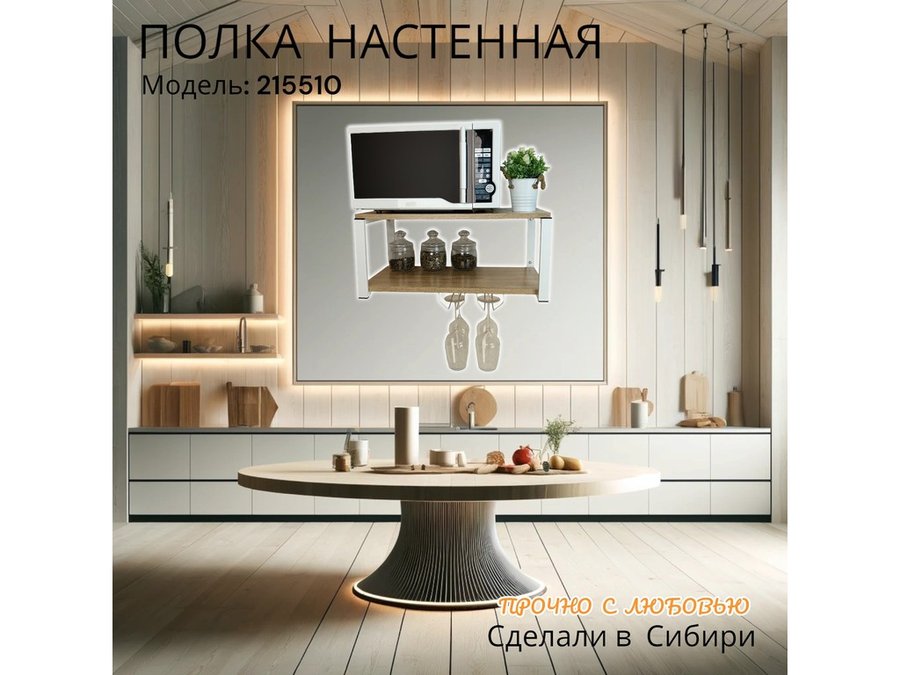 • Полка надежно крепится к стене при помощи анкеров или шурупов с дюбелями, на ней можно разместить микроволновую печь, кухонную технику, посуду, специи