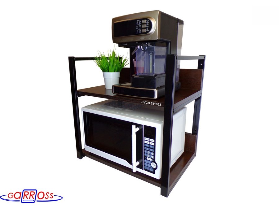 • Полка надежно крепится к стене при помощи шурупов с дюбелями, на ней можно разместить микроволновую печь, тостер, кофемашину, чайник, посуду, специи