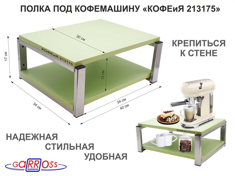 В корзину Купить в 1 клик Полка под кофемашину к стене, высота 17см, серебристый "КОФЕиЯ 213175" полки 30х40см, салатовый