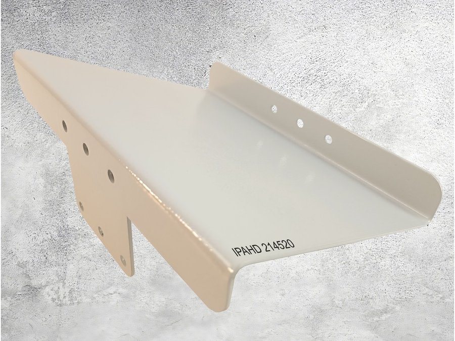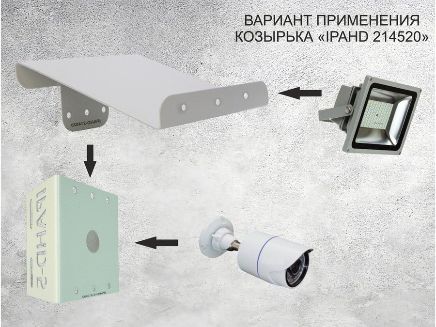 • Кронштейн-козырек крепится на стену и кронштейны на столб серии IPAHD для видеокамер, оснащенные тремя отверстиями для креления опций. На козырьке спереди есть три отверстия для крепления прожектора