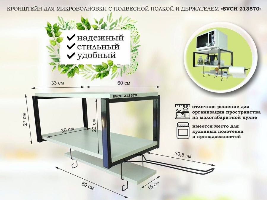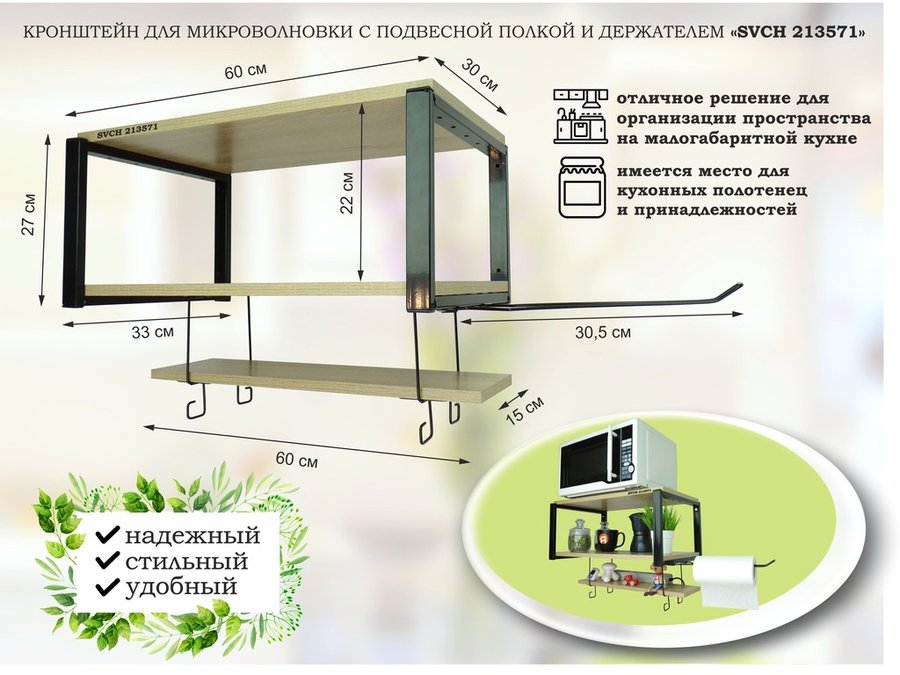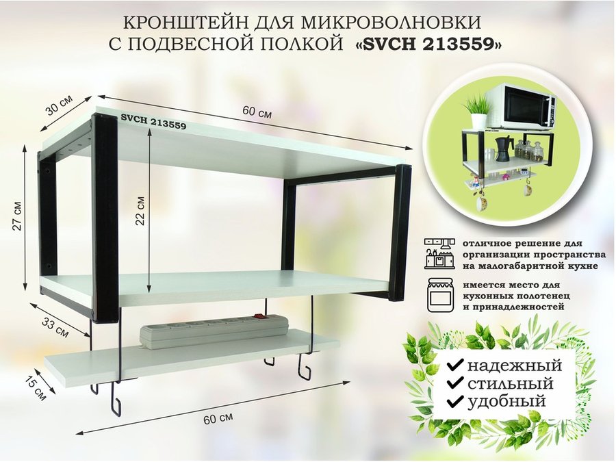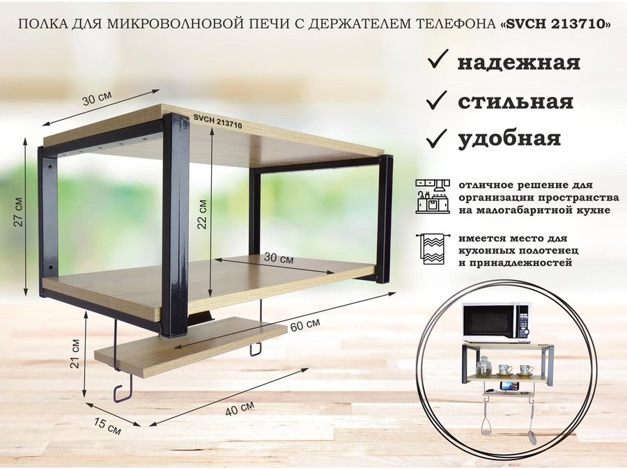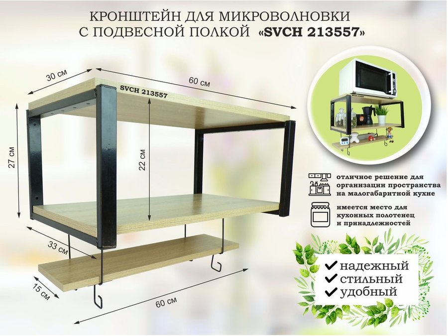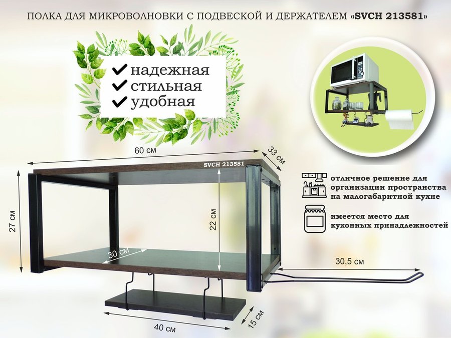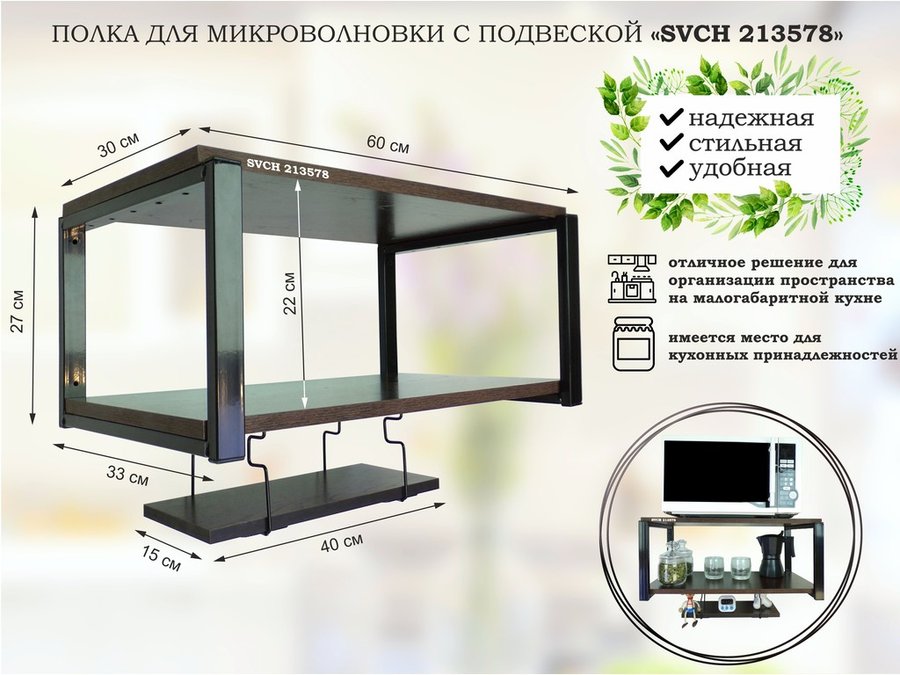 В корзину Купить в 1 клик Полка для микроволновки 60х30см с подвеской 40х15см, 27см, черный "SVCH 213579",сосна, с держателем