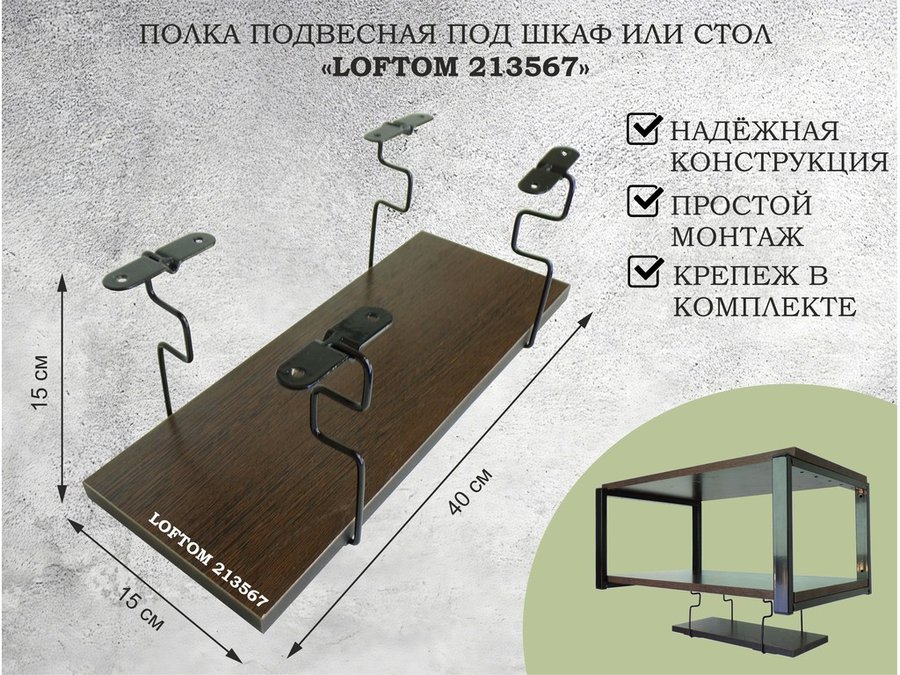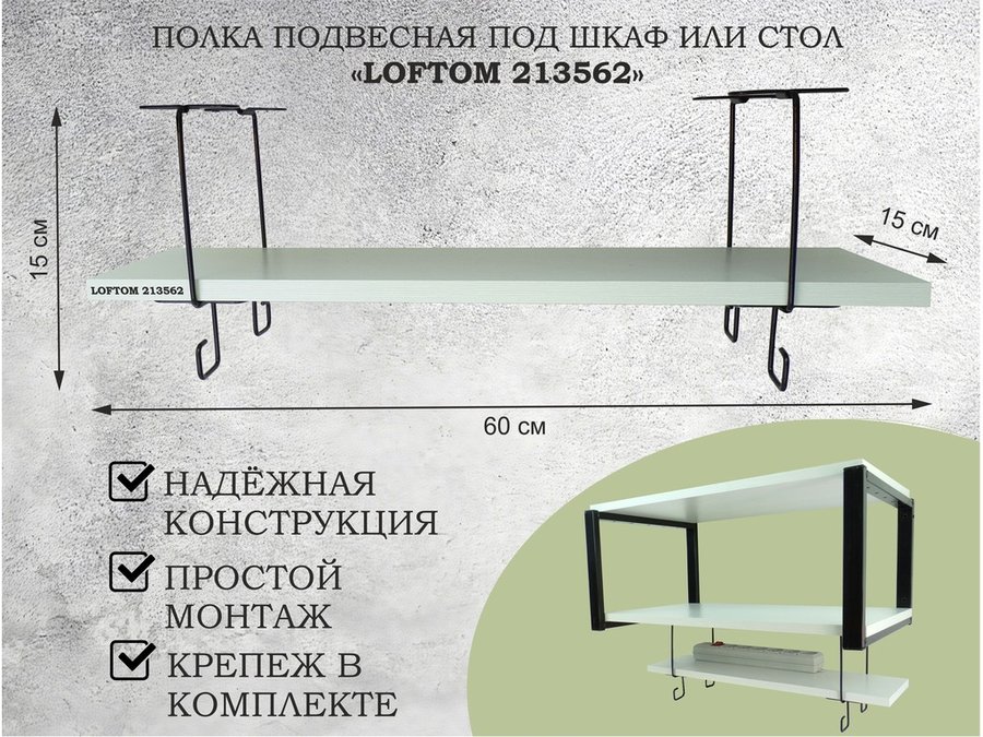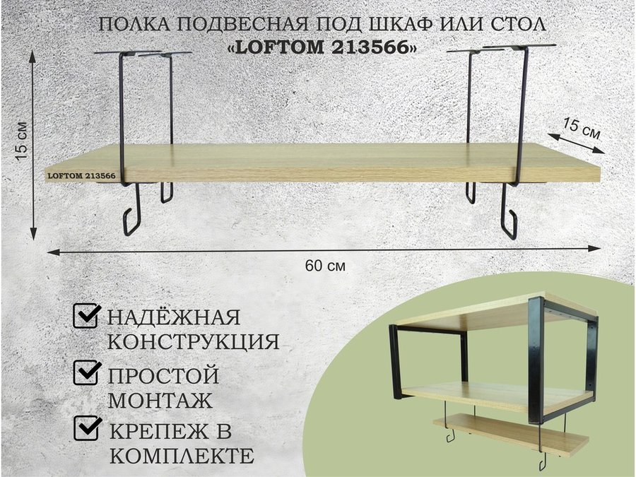В корзину Купить в 1 клик Полка подвесная под шкаф или стол черная, 60х15 см, дуб "LOFTOM 213566" высота 15см, с крючками