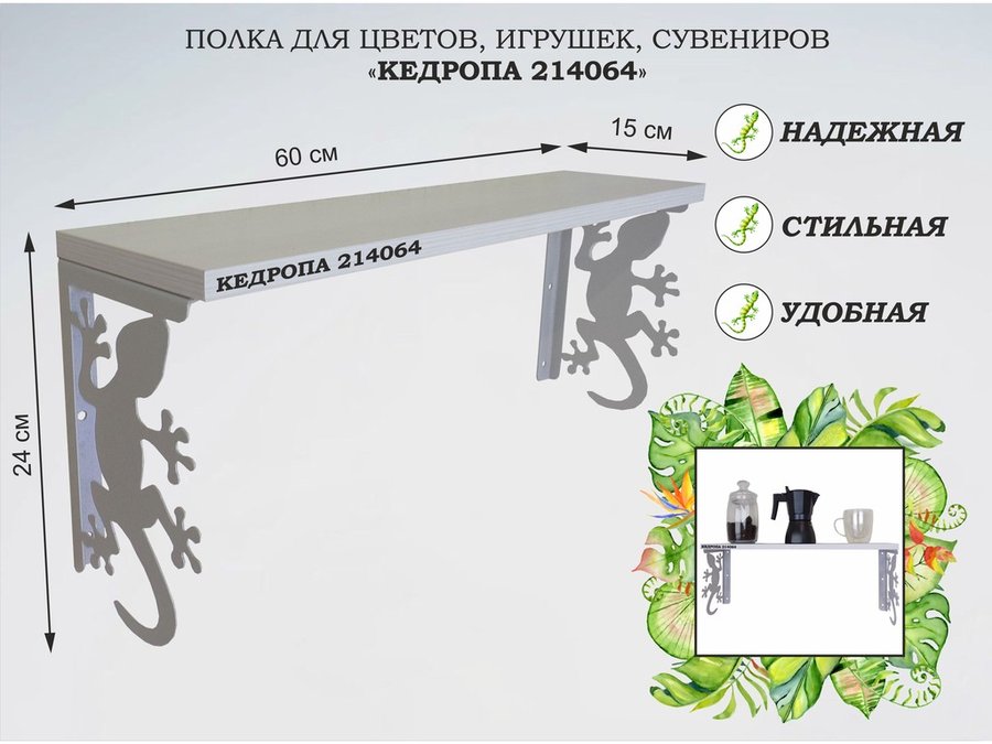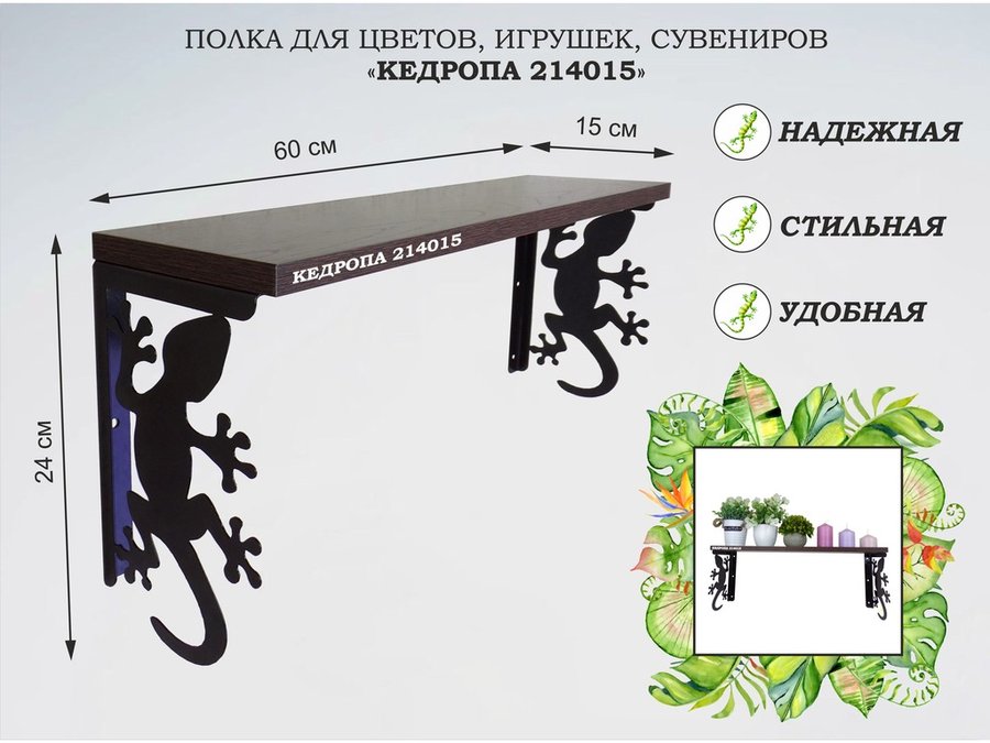 В корзину Купить в 1 клик Полка для цветов, игрушек,сувениров "КЕДРОПА-214015 гекон" размер 15х60х24 см, венге