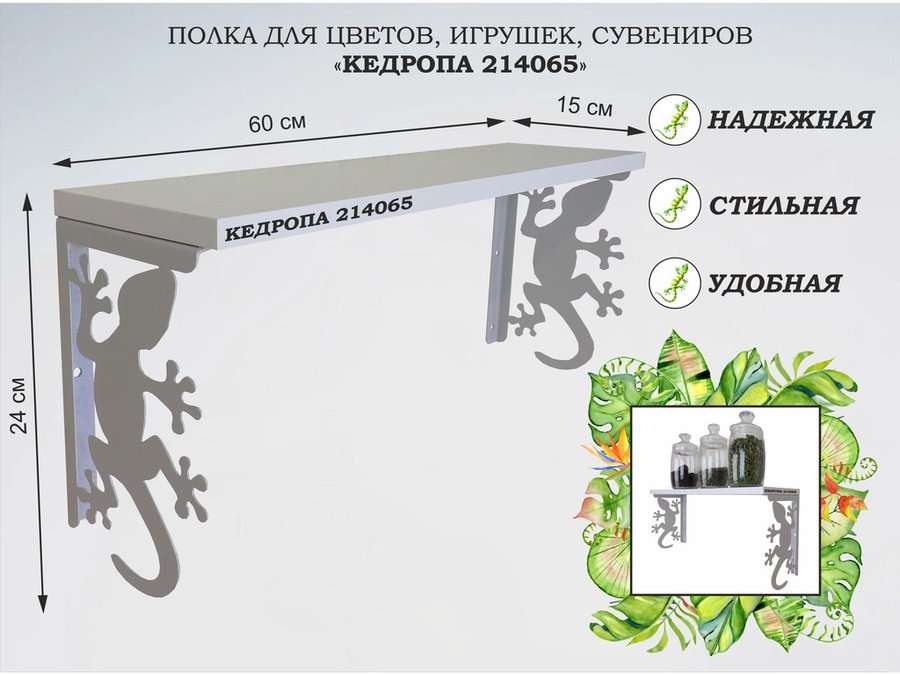 В корзину Купить в 1 клик Полка для цветов, игрушек,сувениров "КЕДРОПА-214065 гекон" размер 15х60х24 см, серый, белый шагрань