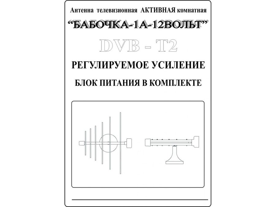 - "БАБОЧКА- 1А-5ВОЛЬТ" АКТИВНАЯ комнатная телевизионная антенна предназначена для приема цифрового DVB-T2 и аналогового телевизионного сигнала ДМВ диапазона