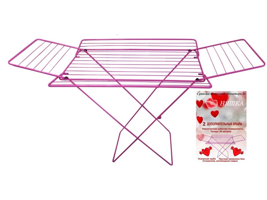В корзину Купить в 1 клик "БОГАТЫРЬ-3" НЯШКА cушилка напольная, ЧЕТЫРЕ КРЫЛА, усиленная (труба и струны) РОЗОВАЯ 26 метров