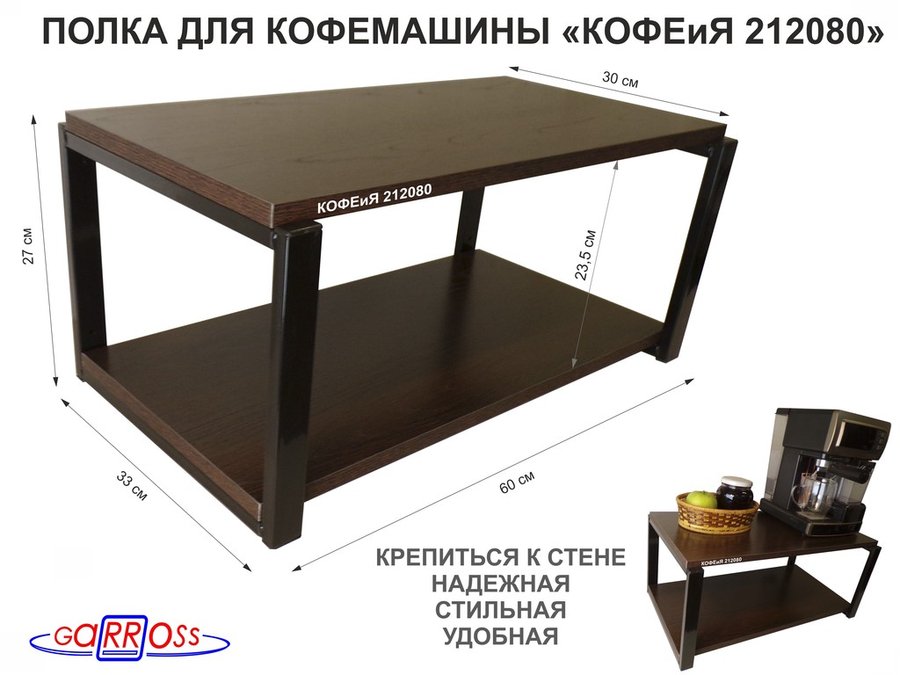 В корзину Купить в 1 клик Полка под кофемашину к стене, высота 27см, серый каркас "КОФЕиЯ 212077" полки 30х60см, венге