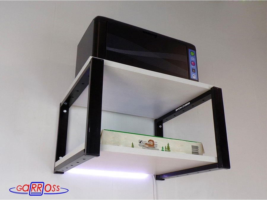 - Полка надежно крепится к стене при помощи анкеров или шурупов с дюбелями, на ней можно разместить принтер, сканер, МФУ и другую офисную технику